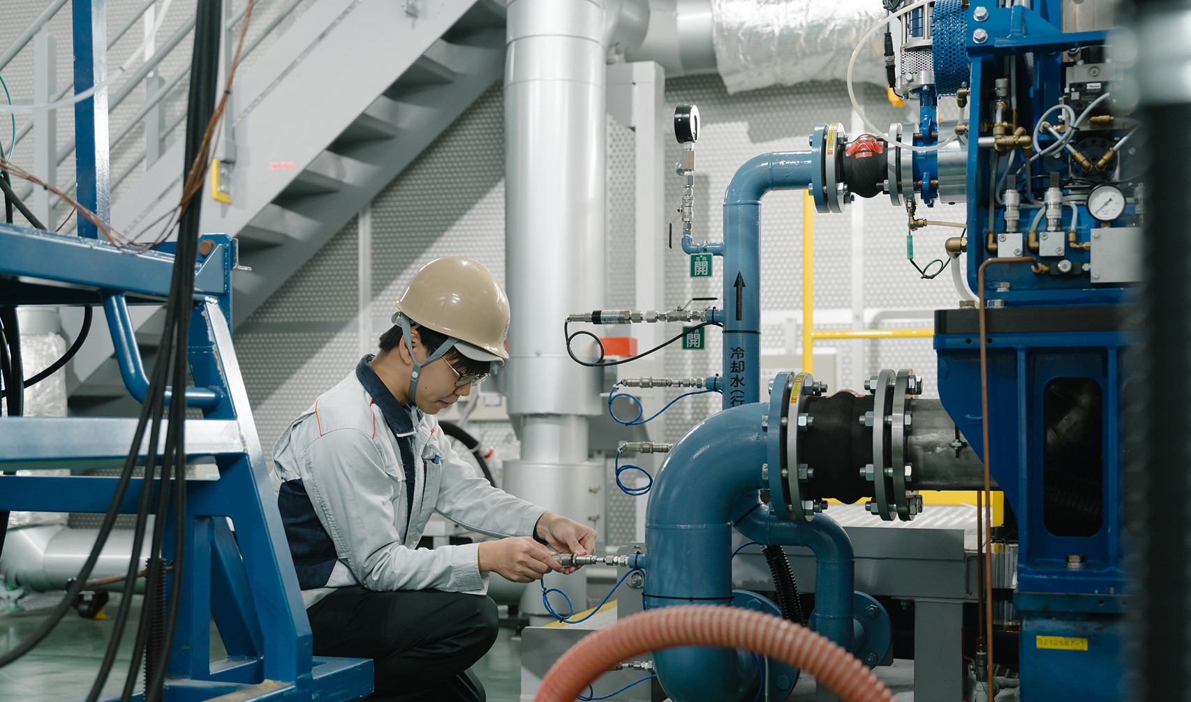 川崎重工業が手掛ける航空用ガスタービンの試験運転に対応するため、新たに製作・納入したのがガスタービン複合エンジン運転設備です。老朽化が進んだ工場の更新に合わせて新設する、という約3年に及ぶ大規模案件でした。