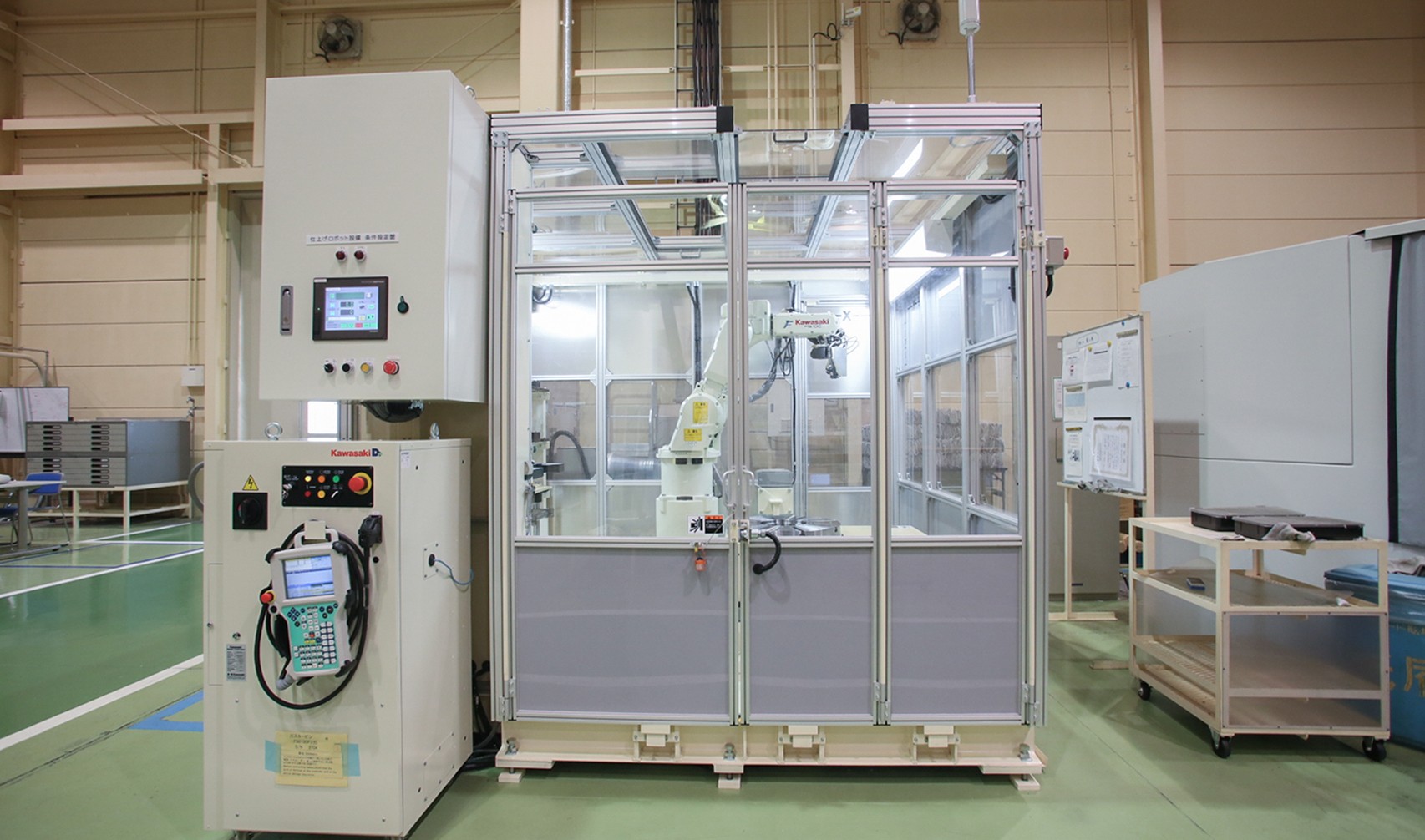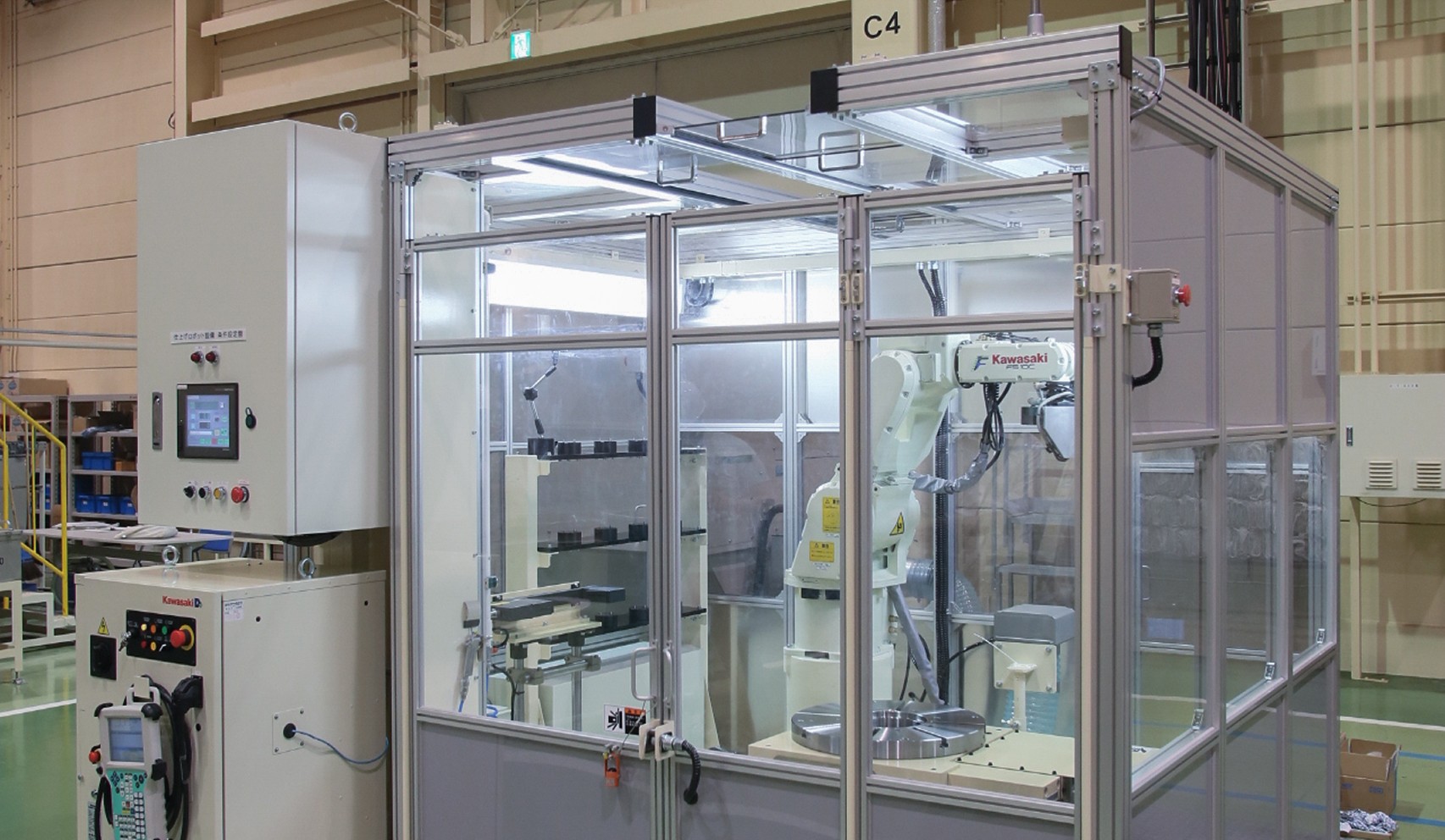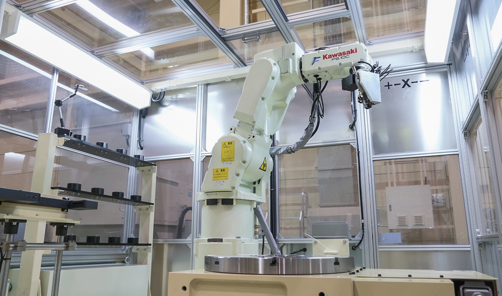 円盤形状の部品を精密に回転させながら加工するため、ロボットの第7軸として円テーブル(ポジショナ)を設置しました。工作機械用の高精度テーブルをカワサキロボット向けにカスタマイズし、高精度角度割り出しと同時7軸制御を実現しています。