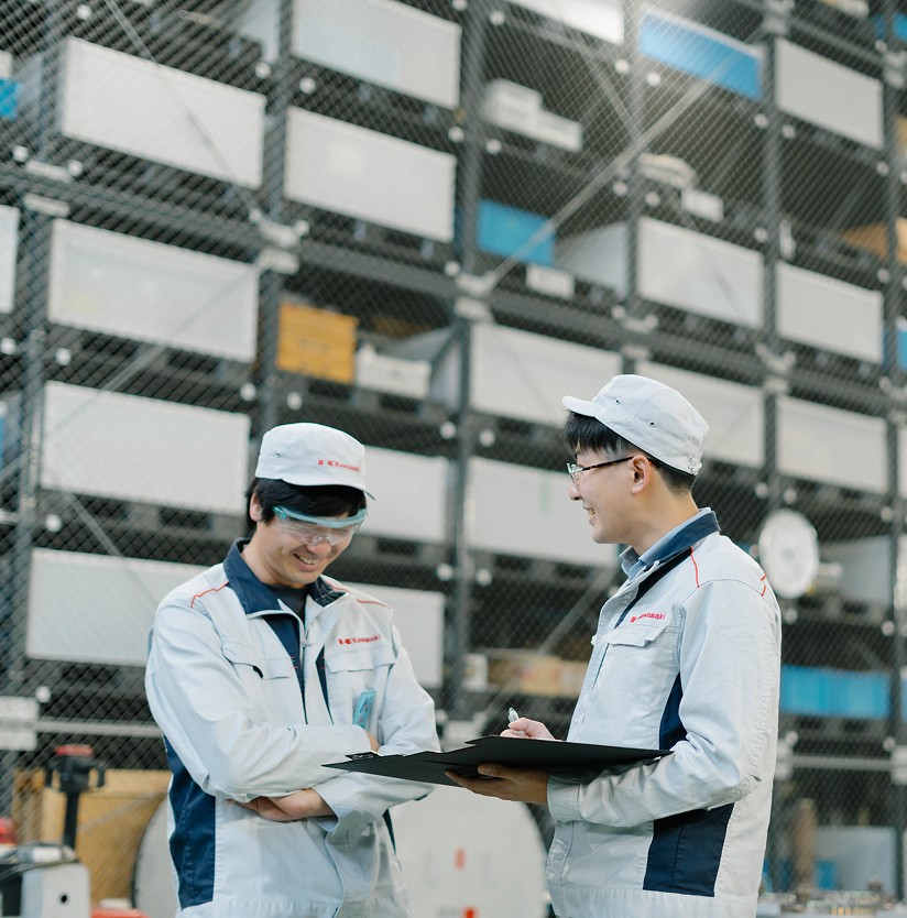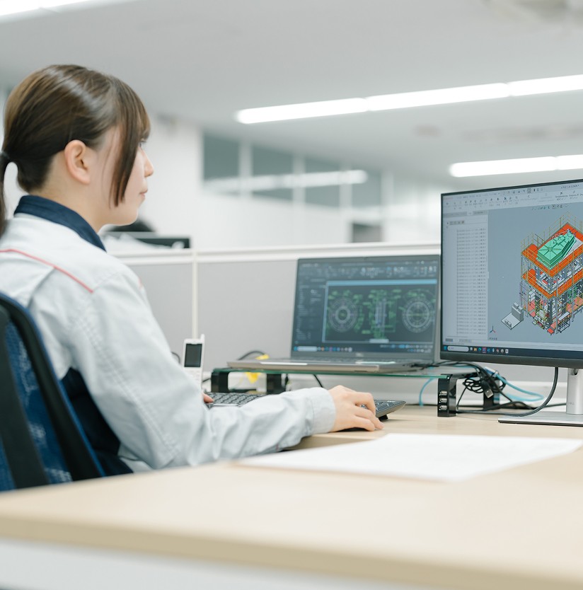 技術系職種は、当社のものづくりを支える中核的な役割です。機械や電気制御の設計・メンテナンス、ガスタービンの整備、設備保全、品質保証等、活躍できる専門分野は幅広く揃っています。入社後は研修やOJTを通じて、段階を踏みながら知識と技術を身につけられるため、すぐに専門知識を求められる不安はありません。現場で実際に技術力を発揮しながら、着実に成長していける環境です。また、自分が関わった製品や設備が動き、お客様から直接感謝の声をいただく場面も多く、技術者としてのやりがいや達成感を日々実感できます。