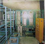 ・工事用のリースプレハブ事務所の窓、扉をコンベヤー上に置き高圧水で