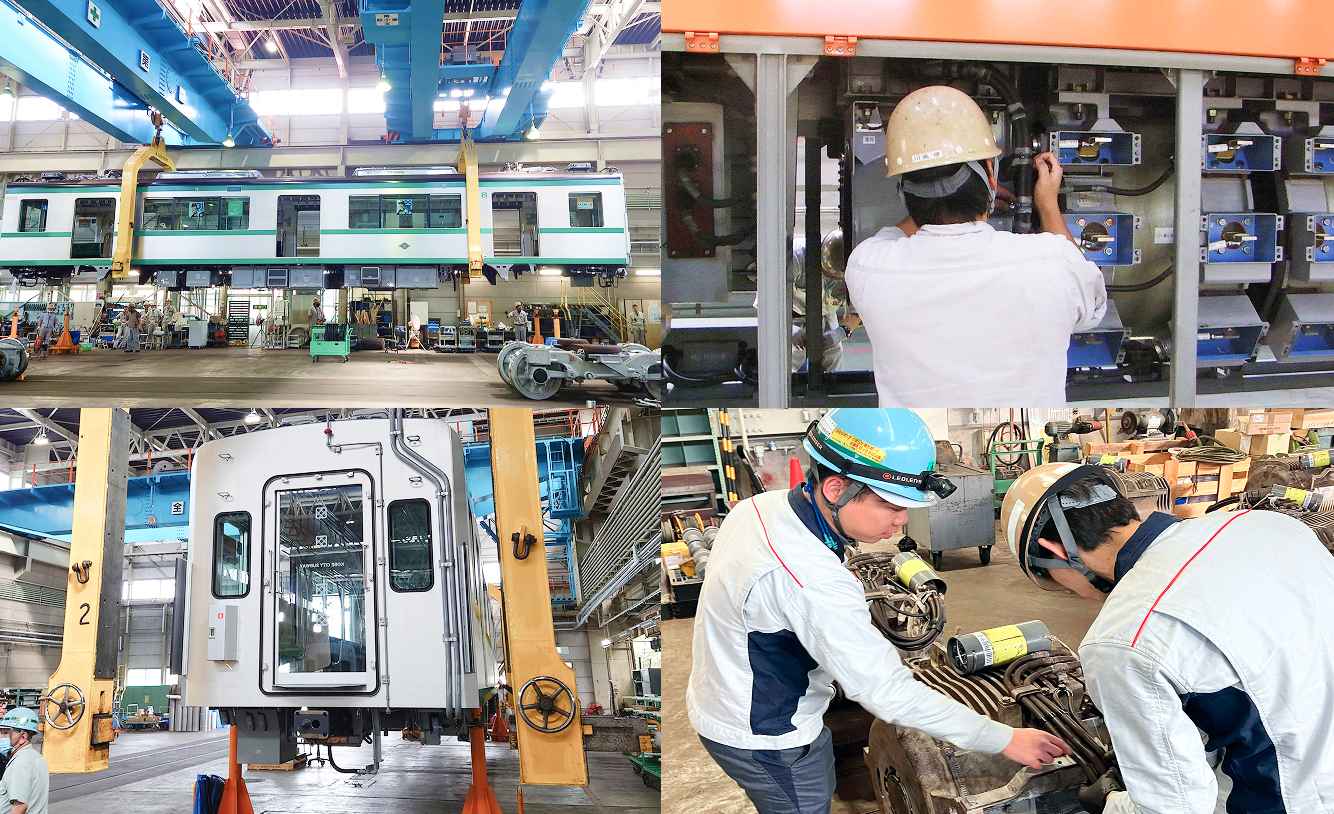 搭載機器や主電動機のメンテナンスから、大掛かりな設備が必要となる車体・台車の整備と幅広く対応。整備後は確かな性能を確認するため、機器の単体試験やユーザー(鉄道事業者)と共に車両走行試験を実施。かすかな異常も見逃さない心構えを以って、車両異常や不具合の早期発見を行い検修品質に万全を期しています。