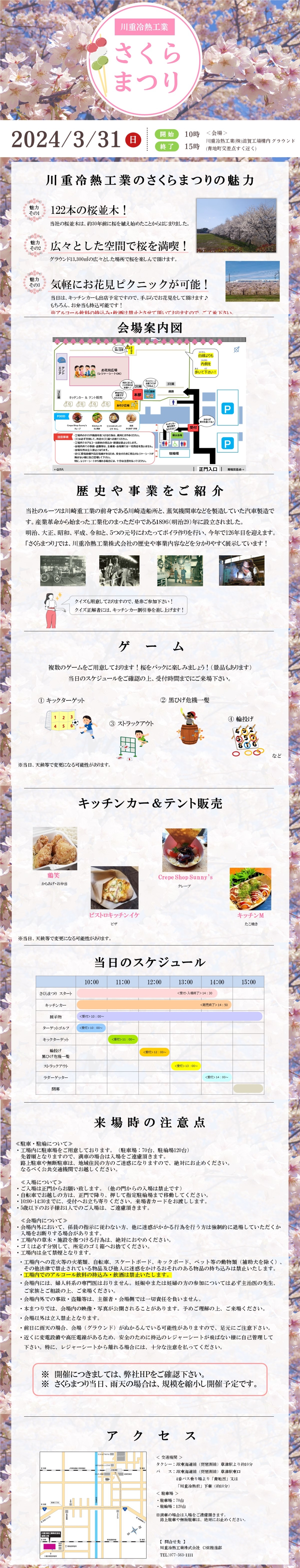 川重冷熱工業滋賀工場では、敷地内の桜並木を従業員やその家族・友人、および近隣地域の皆様をご招待 し、楽しんでいただく「さくらまつり」を開催いたします。 今回ご招待するのは、近隣5町内会(青地第一、青地第二、追分、ロクハタウン、上尾)の皆様とさせてい ただきました。 (この「さくらまつり」は今回が初開催であり、ご来場の皆様の安全を確保するため、ご招待する地域を 限定させていただきました。) 近隣5町内会の皆様、お気軽にお越しください。お待ちしております。