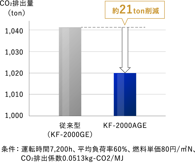 ※KF2t/h×1缶と従来ボイラ効率96%小型貫流ボイラ2t/h×1缶の比較。平均負荷60%、7,200h/年