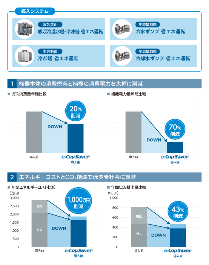 吸収冷温水機・冷凍機の消費燃料と補機の消費電力を大幅に削減。エネルギー消費・CO2排出量の削減で低炭素社会に貢献。