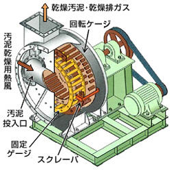 - 中心機器である気流乾燥機(解砕機)は、回転・固定ケージによって塊状汚泥を解砕し、表面積を増大させながら直接熱風と接触して瞬時に乾燥します。