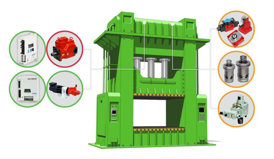 大出力で高速化が求められる鍛造プレス用の高圧・大容量油圧システム。製品の品質向上のために、高精度な加圧シリンダの速度・位置・圧力制御が求められる深絞りプレスや成形プレス用の油圧システム。川崎重工は1965年、わが国ではじめて油圧プレスに電気油圧サーボシステムを導入して以来、制御技術、ショック低減技術、低騒音技術などの研究開発を重ね、高圧・大容量でありながら、静かで信頼性の高い油圧システム・機器をお届けし、この分野で確かな実績を築いています。