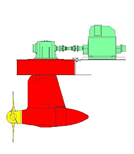 主電動機を船内に配置したオープンプロペラの推進装置です。