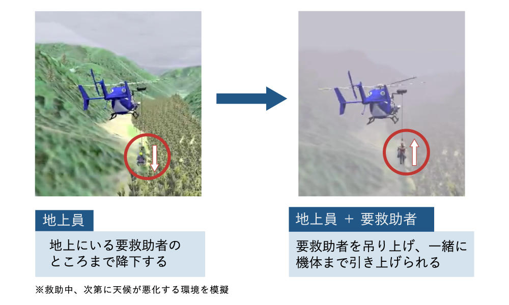 | ・ | 全訓練者(操縦士、副操縦士、搭乗員)が同じVR空間の共有によって、より臨場感のある訓練の実現 | ||