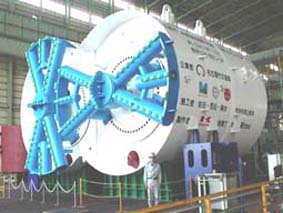 今回完成した複心円土圧式シールド掘進機は、左右各1基ずつ計2基のカッターディスクを装備し、同一平面内をお互いが干渉しないように同期制御を行ないながら掘進するもので、単円式シールド掘進機に比べ不要断面を少なくできるとともに2本のトンネルを同時に掘削でき、安全性・信頼性が高く工期が短いという特長があります。なお、このシールド掘進機は今後工場にて分割して、現地に搬送し再組立・試運転を行なった後、2002年1月より掘削開始の予定です。